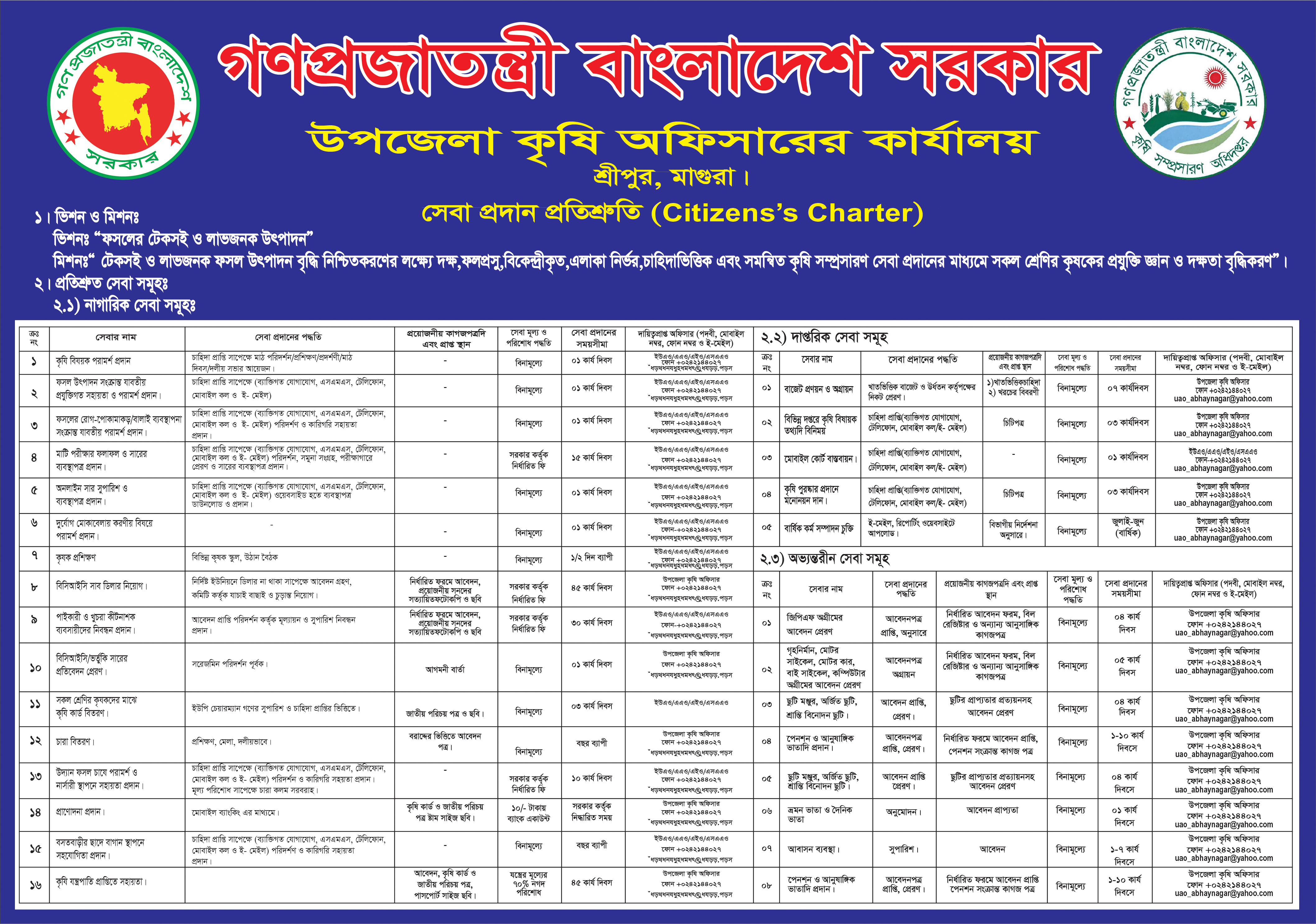 কৃষি সম্প্রসারণ অধিদপ্তর একটি সরকারী সেবামূলক প্রতিষ্ঠান। এ অধিদপ্তরের মূল দায়িত্বই হচ্ছে আধুনিক ও লাগসই প্রযুক্তি হস্তান্তরের মাধ্যমে এদেশের কৃষি উন্নয়ন কর্মকান্ডেজড়িত বিভিন্ন সংস্থা/প্রতিষ্ঠানের সাথে যোগসূত্র রচনা কওে কৃষি উন্নয়নের গতিধারাকে ত্বরান্বিত করা। এ কাজে কেন্দ্র থেকে মাঠ পর্যায় পর্যন্ত প্রায় ২৪,০০০ জন কর্মকর্তা কাজ করছেন। প্রযুক্তি হস্তান্তরের ক্ষেত্রে কৃৃষি পরিবেশ, কৃষকের আর্থ-সামাজিক অবস্থা, বাজার চাহিদা ইত্যাদি বিষয়কে গুরুত্ব দিয়ে কৃষি সম্প্রসারণ অধিদপ্তর এদেশের কৃষি ও কৃষকের সেবা প্রদান কওে আসছে। এ অধিদপ্তরের সিটিজেন চার্টার নিম্নরুপ: